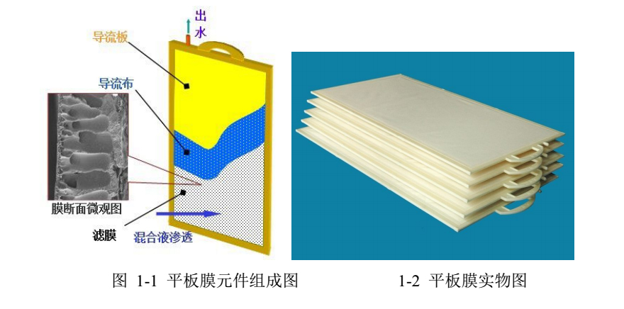 平板膜元件由濾膜、導流布及導流板組成,在導流板的頂端設有一個抽吸口,膜池中的活性污泥被阻隔在膜元件的外部,過濾后的水通過膜元件抽吸口在負壓作用下被抽出。平板膜元件結構示意圖及實物照片見圖1-1、圖1-2